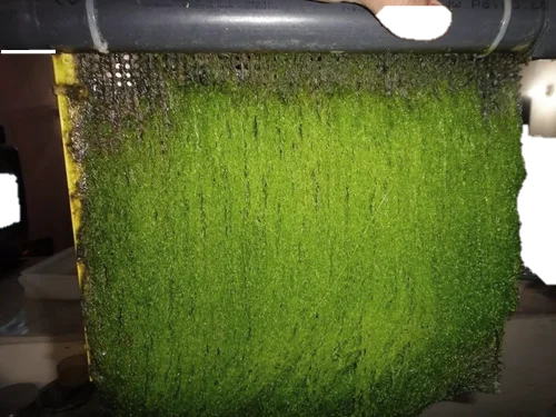 Con el paso del tiempo, la lámina plástica se va recubriendo de una gruesa capa viscosa, formada por la colonia de microalgas adheridas a ella, lo que consigue dos cosas: 1) eliminar las microalgas de la urna principal y contenerlas en un dispositivo controlado, y 2) que toda el agua que va cayendo sobre esa capa de microalgas ya establecida, se vaya filtrando poco a poco, siendo devuelta al acuario a través de una tubería de salida, completamente limpia y depurada.