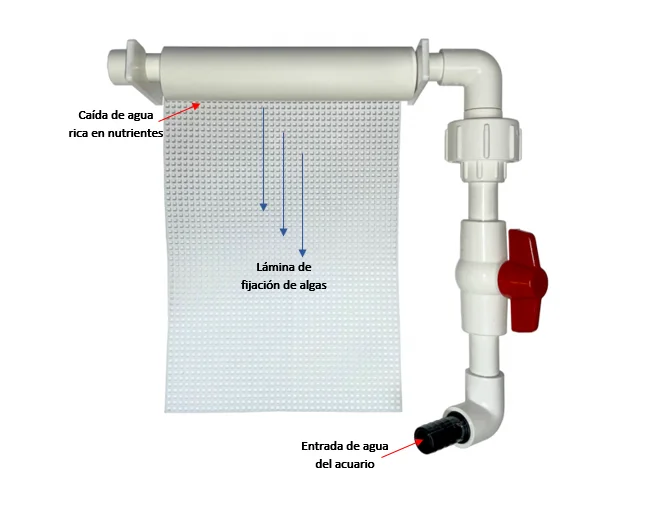De esta forma se potencia que la caída de agua se realice de manera uniforme por toda la superficie de la lámina y el contacto con el agua sea más lento y completo, para que el asentamiento de microalgas y la posterior absorción de los nutrientes sea la mayor posible. Además, el sistema de entrada cuenta con una llave de flujo con la que se puede modificar la velocidad y cantidad de entrada de agua al aparato.