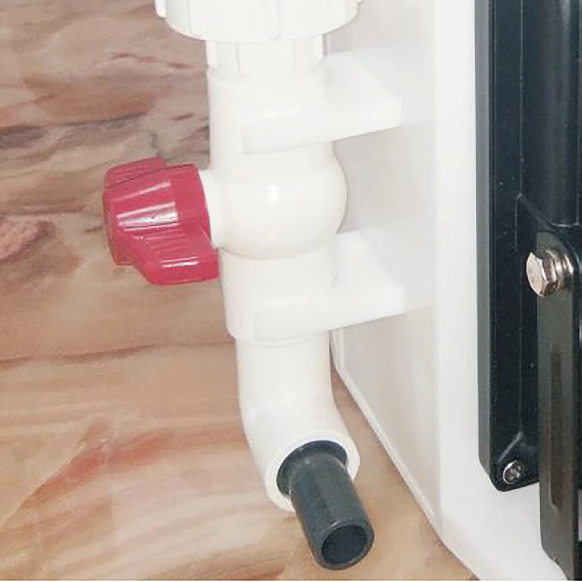 Por último, en la zona de la salida de agua hacia el acuario, el depurador de algas Aqua Ocean cuenta con una doble salida como desagüe de emergencia, de esta forma, en caso de taponarse la primera salida por acumulación de suciedad o masa de microalgas, este desagüe permitirá la salida del excedente de agua evitando que se vaya acumulando y pueda desbordarse por la parte superior del dispositivo.