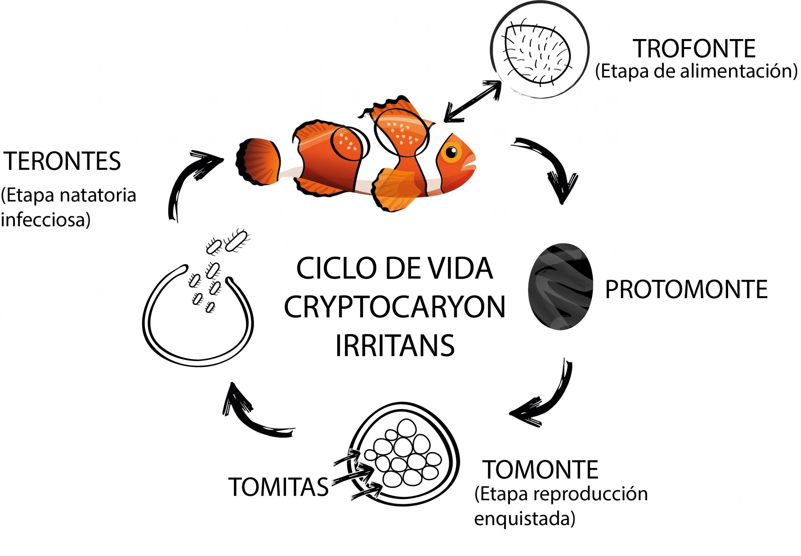 Este parásito presenta varias etapas de vida tal como se ve en la imagen, y cada una de ellas dura un tiempo determinado. Esta duración dependerá de las condiciones del medio donde se encuentre el parásito y del estado físico de este. Por otro lado, las temperaturas óptimas de desarrollo del parásito estudiadas parecen ser entre 24 y 27°C (Brown, 1951), rango al que normalmente mantenemos los acuarios marinos tropicales.