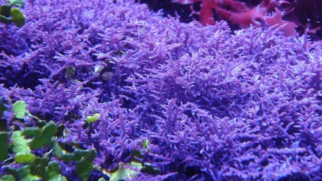 Ahora vamos a aportar un poco de color con un alga perteneciente a la clase Rhodophyta, es decir un alga roja, aunque este género en concreto presenta un bonito y llamativo color púrpura-azulado. Esta macroalga es también flotante, es decir no se ancla a ningún tipo de sustrato, aunque crece de forma masiva, enredando sus talos alargados con ramificaciones, creando una masa de “ramas” compactas. Debido a su atractivo aspecto mucha gente opta por utilizarla como especie ornamental dentro del acuario, pero es igualmente ideal para colocar en refugios en sumps.